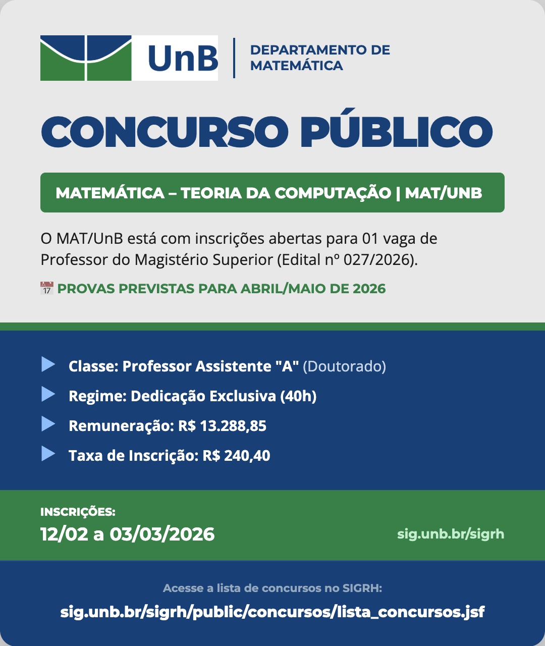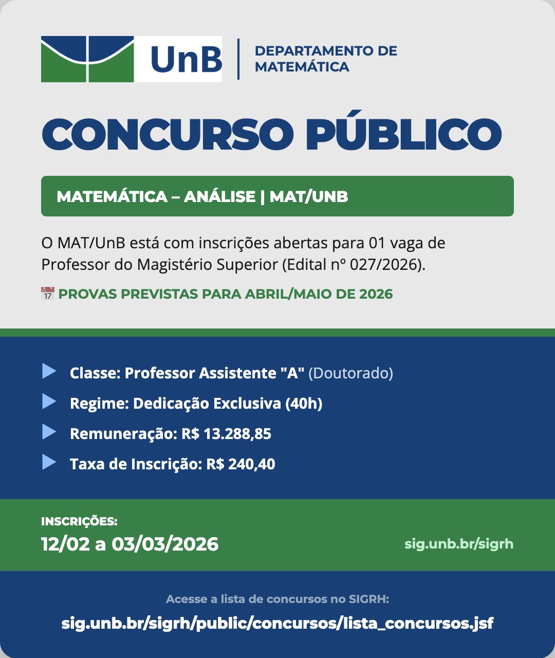 Educação Inclusiva Educação Inclusiva - ensino Details Published: Friday, May 31 2024 11:48 SOBRE O EVENTO O evento possibilitou o debate e a problematização do conceito de inclusão no contexto da docência em matemática na Educação Básica. De modo especial, socializou experiências de formação desenvolvidas em cursos de Licenciatura em Matemática que preparam o(a) futuro(a) professor(a) para a prática docente em salas de aula com estudantes inclusos. Igualmente, divulgou práticas inclusivas vigentes na Secretaria de Estado e Educação do Distrito Federal (SEEDF), de modo a informar os(as) licenciandos(as) do Curso de Licenciatura em Matemática da UnB e demais participantes. Membros Função Nome Coordenadora Geral Regina da Silva Pina Neves Coordenadora Adjunto Raquel Carneiro Dorr Comissão Organizadora Cleyton Hercules Gontijo Comissão Organizadora Maria Dalvirene Braga Comissão Organizadora Janaína Mendes Pereira da Silva Colaboradora Carina Maia de Castro Mundim Colaborador João Vitor Texeira Moura Monitora Isabela Cristina de Paula Walter Monitora Raiane Lopes da Cruz Monitor Magno Ramos Azevedo Monitor Danilo Sobral Brasil Palestrante Alexandre Toletino de Carvalho Palestrante Dayse do Prado Barros Palestrante Carine Almeida Silva Noleto Palestrante Wesley Pereira da Silva Palestrante Erica Santana Silveira Nery Palestrante Marlon Silva dos Santos Palestrante Gizelle Pires Ferreira Mendes Últimas Notícias Concurso público na área de Álgebra Inscrições de 12/02 a 03/03/2026 Concurso público na área de Análise Inscrições de 12/02 a 03/03/2026 Concurso público na área de Teoria da Computação Inscrições de 12/02 a 03/03/2026 Oportunidade de bolsa no projeto "Observatório: Novo Ensino Médio no DF na área de Matemática e suas Tecnologias" Disponibilidade de 01 bolsa, inscrições até 14/01/2026