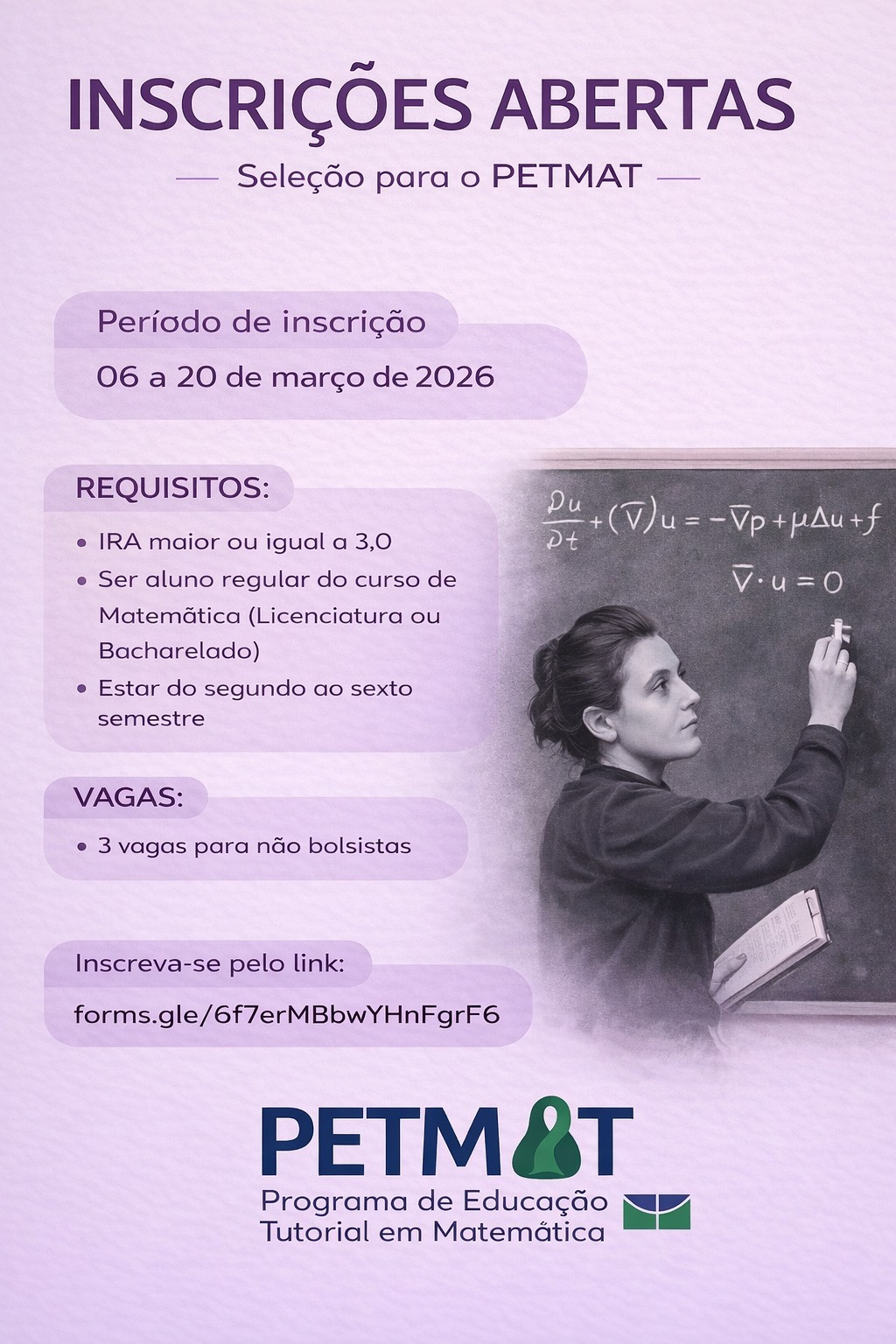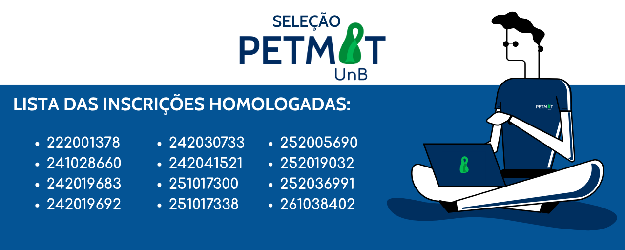 De 06/03 a 20/03 estarão abertas as inscrições para novos integrantes do PETMAT! Acesso ao edital. Inscrição aqui.