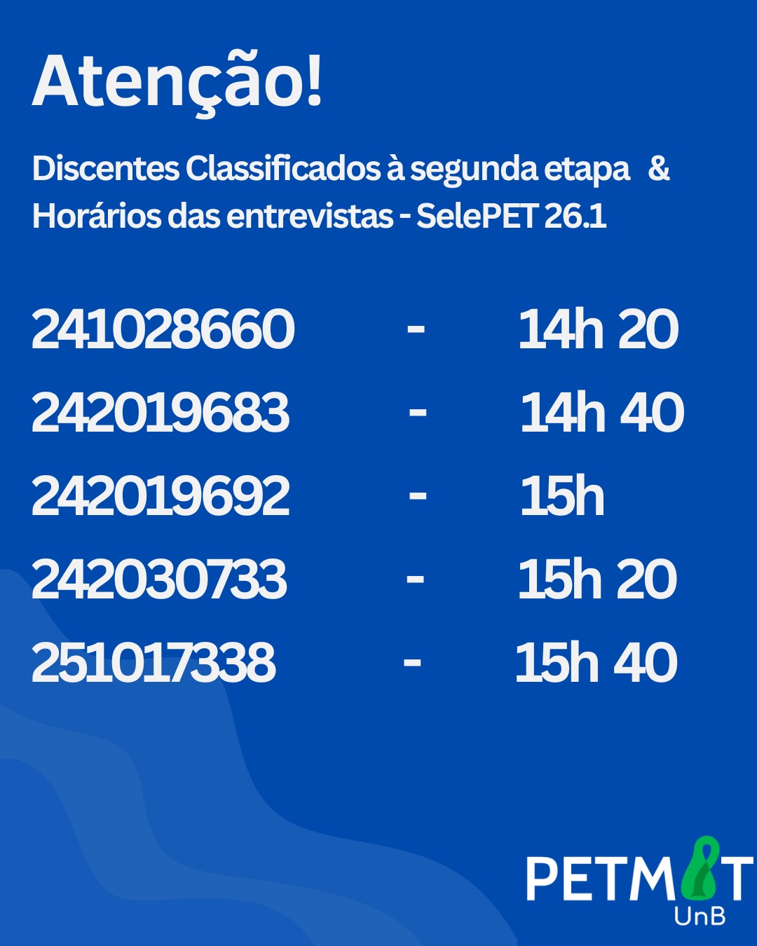 A lista de discentes classificados para a 2ª etapa, com os respectivos horários de entrevista no dia 27/03 (sexta), está disponível aqui.